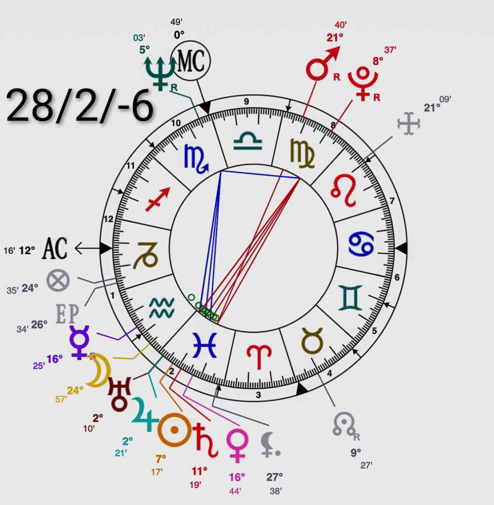 Voilà, 6 « astres sur 7 s’opposant 3 par 3 lors d’une pleine lune, le septième se mettant au service du Soleil. Les planètes Jupiter et Saturne sont dans le même signe en position élevée en 10 avec la Lune.