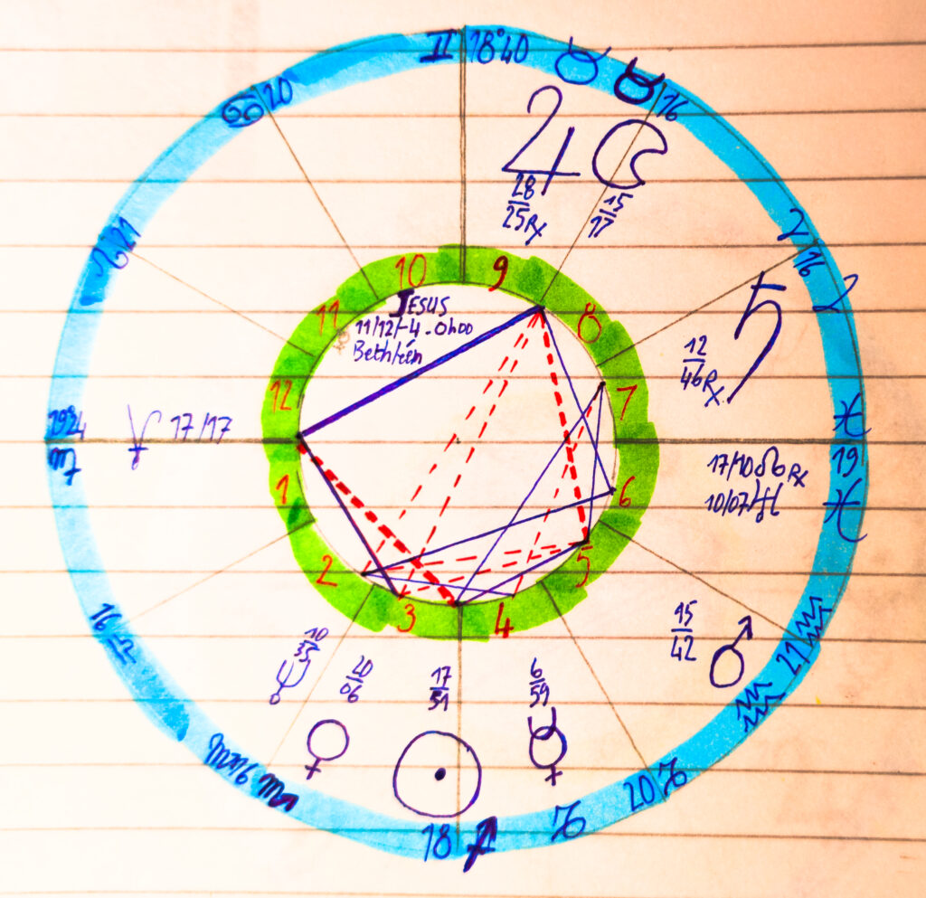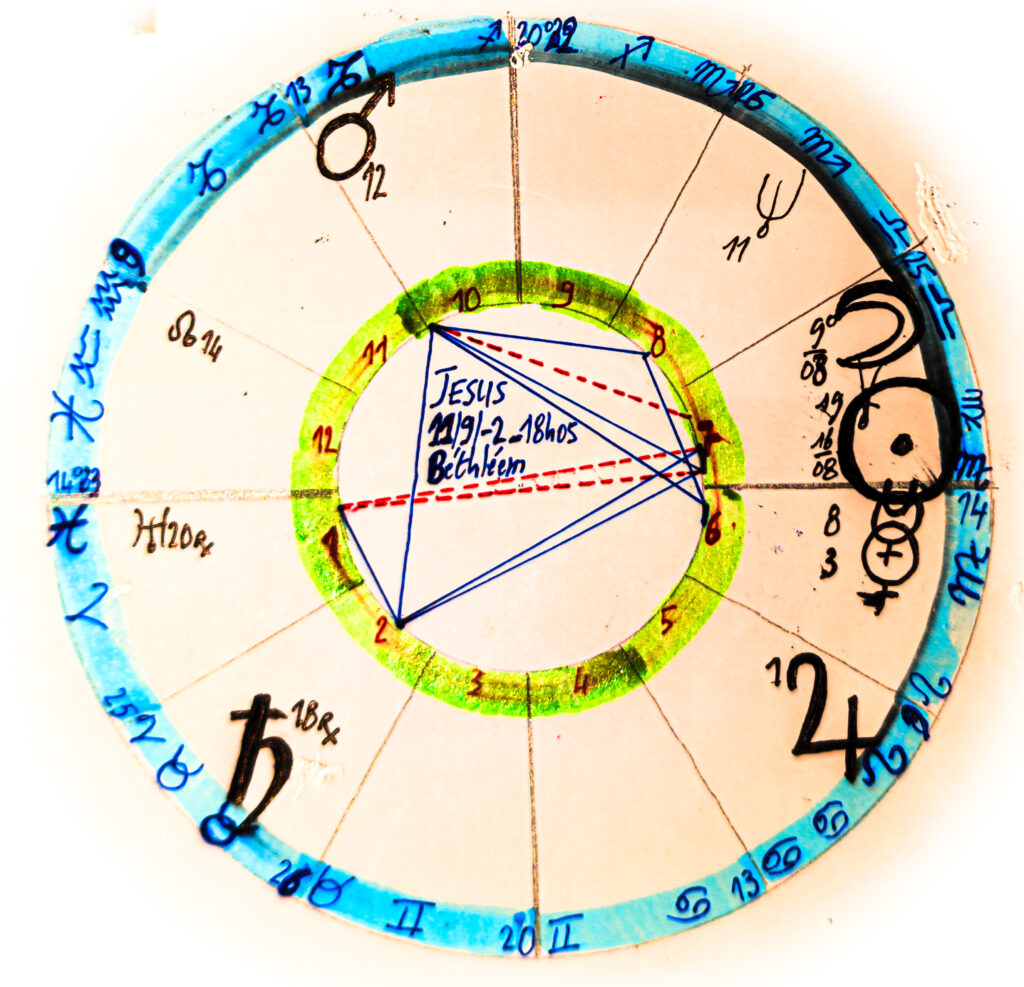 Le thème nous montre donc 5 planètes en 36°, dont 4 en Vierge. En maisons 6 et 7, la famille des luminaires avec Lune en Balance et ses deux enfants sages Vénus et Mercure, accompagnés du sinistre Dieu des Enfers. Mars et Neptune sont élevés, Uranus 20°02’ au lever s’oppose à Pluton 19°36’. Jupiter sans aspects en Lion renforce le Soleil, son maître. Les aspects forment la figure remarquable d’une pyramide ou d’un tétraèdre. Encore une fois, pour nos yeux aveugles, peu de choses qui font penser au Fils de l’Homme et encore moins au Fils de Dieu.