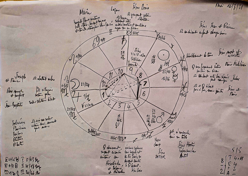 Dessin des aspects déjà remarquable ressemblant de façon incompréhensible 1 an 5 mois et 6 jours après au précédent d’Ernest Martin. Conjonction Jupiter-Lune à nouveau et au Levant. Saturne culminant déjà.