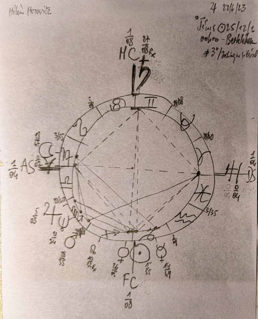 Le thème nous montre la même conjonction Jupiter-Lune que Jehanne, élevée ici en Taureau en 9, Soleil angulaire recevant les bons aspects de Saturne comme pour Jehanne et c’est tout si l’on veut s’en tenir à l’essentiel. Rien qui ravisse ou étonne sauf l’angularité extrême du Soleil 17° 51’ en Sagittaire sur l’axe vertical Gémeaux-Sagittaire et celle des nœuds lunaires 17° 10’ en Poissons-Vierge sur l’ axe horizontal, hôte en outre de Pluton 17°17’ à l’Ascendant en Vierge (17, TOV en hébreu, signifie BON, un des noms de Dieu et ce n’est donc pas rien. Ce nombre trois fois saint, « narcissique » (1 au cube + 5 au cube + 3 au cube = 153) renvoit aussi aux 153 poissons de la dernière pêche miraculeuse puisque, nombre « triangulaire », 1+ 2 + 3 +… + 17 = 153). Comme il s’agirait également du cent-cinquante-troisième mot de la Bible et du jour de l’aterrissage de l’Arche sur le mont Ararat, 17ème jour du 7ème mois, nous pouvons passer du premier livre de la Bible, la Genèse, au Prophète Ezéchiel 47.9-10 et là, je vous laisse chercher sur internet ce qu’en dit, parait-il, Marc Rastoin.